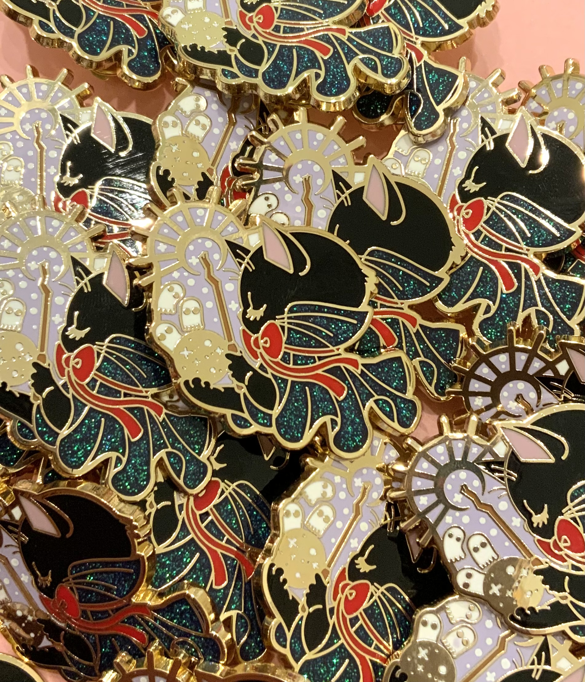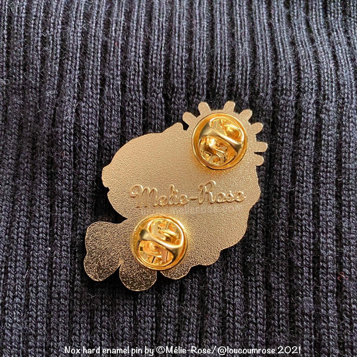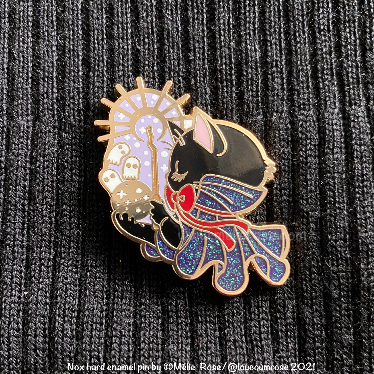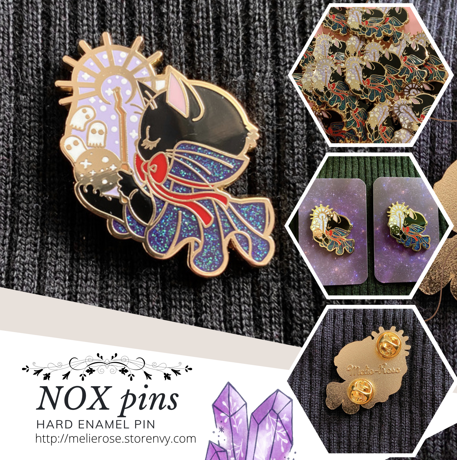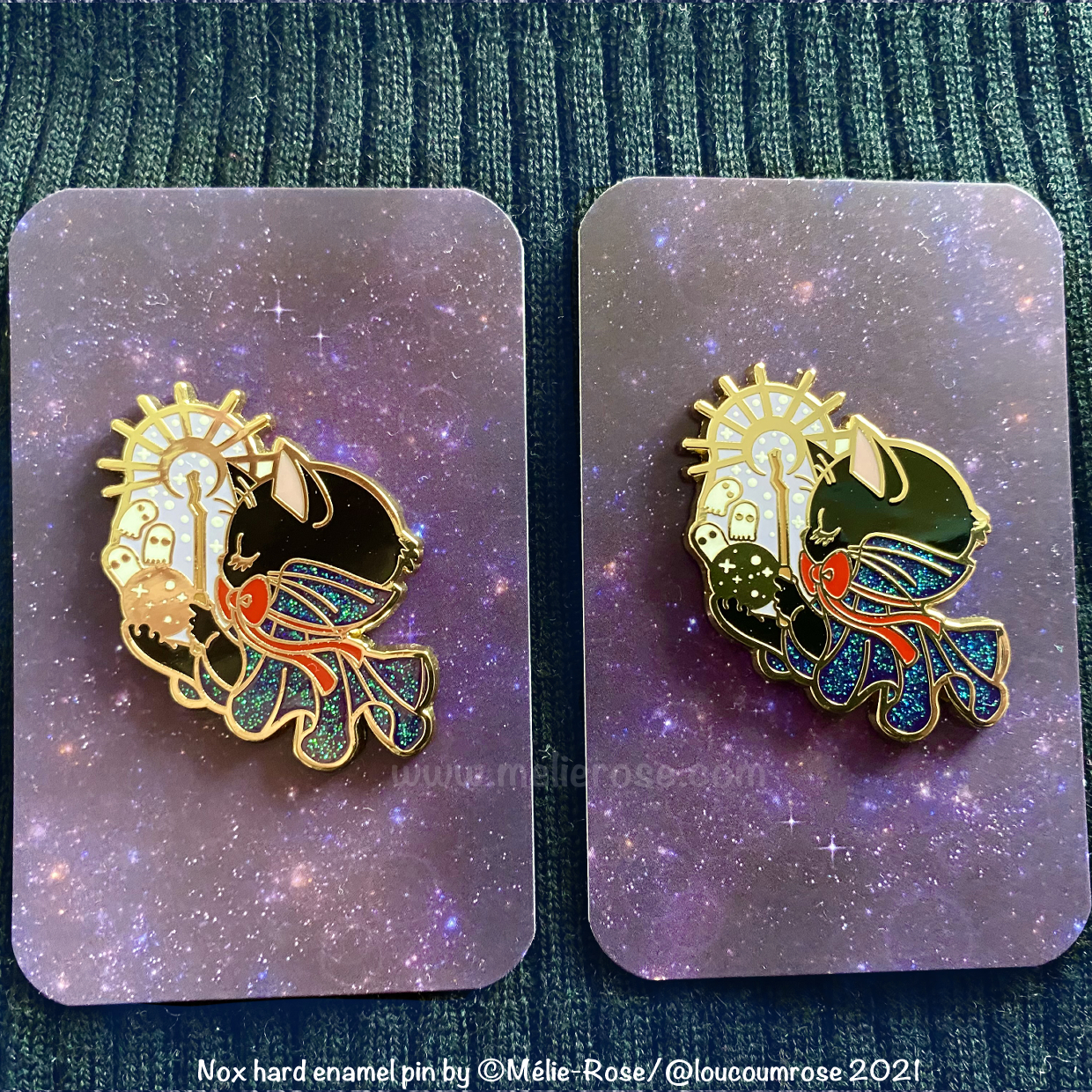 Hard enamel pin of a black cat called NOX Size: 1,5 inches Gold plating Butterfly clutch Glitter on the cat’s coat